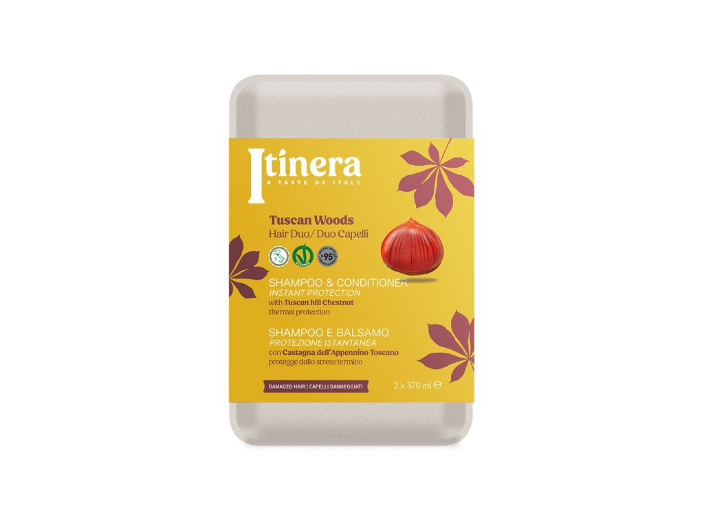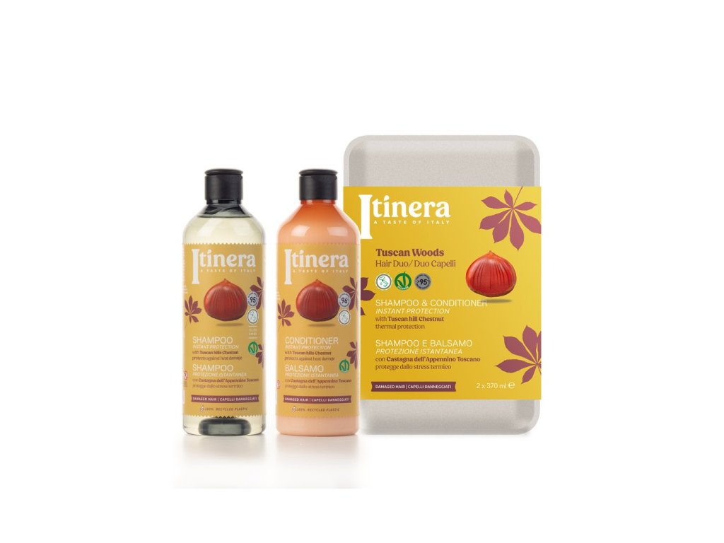 Zajistěte svým vlasům maximální ochranu před tepelným poškozením s pečující sadou Itinera, která obsahuje šampon a kondicionér s bio extraktem z toskánských kaštanů. Tento přírodní extrakt, bohatý na minerály, sacharidy, bílkoviny, vitamíny a aminokyseliny, včetně argininu, pomáhá vlasy posilovat, hloubkově hydratovat a vytvářet ochranný film proti ztrátě vlhkosti při stylingu.